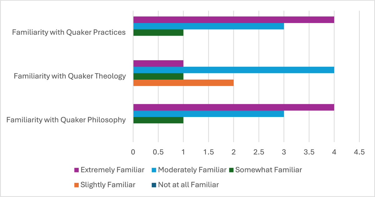 The responses to survey questions are summarised in Figures 1, 2 and 3. As can be seen from Figure 1, all participants reported that they were at least somewhat familiar with Quaker philosophy and practices with the majority falling into the extremely familiar category. The responses regarding Quaker theology, however, were quite different. Most respondents rated themselves as moderately familiar with Quaker theology, however the second largest group only rated themselves as slightly familiar with Quaker theology. The key takeaway from this question is that participants overall likely feel more confident about their understanding of Quaker philosophy and practices and less confident in their understanding of Quaker theology. Figure 2 shows that that all respondents see the Quaker Faith as at least slightly influential, and the majority feel that the Quaker faith is either very or extremely influential in the DEI efforts at the school level, despite noting that this is slightly lower at the individual classroom level. Similar responses were shared in the open-ended question of the survey, where one participant wrote ‘Leadership at our school helps guide the intentional focus of Quakerism from down. These practices are incorporated throughout our school and are the standards by which we instruct and facilitate conflicts, share celebrations, and bring our community together’ and another wrote ‘Quakerism is essential to the ethos of our school community. As such we are always looking back to equality and how it points toward equity’. It was clear from these responses that Quakerism, broadly defined, had a great impact on the DEI efforts at their Quaker schools. Lastly, Figure 3 shows that respondents noted that both Quaker practices and Quaker philosophy inform DEI efforts, but less than half of respondents felt that Quaker theology informs those same DEI efforts.